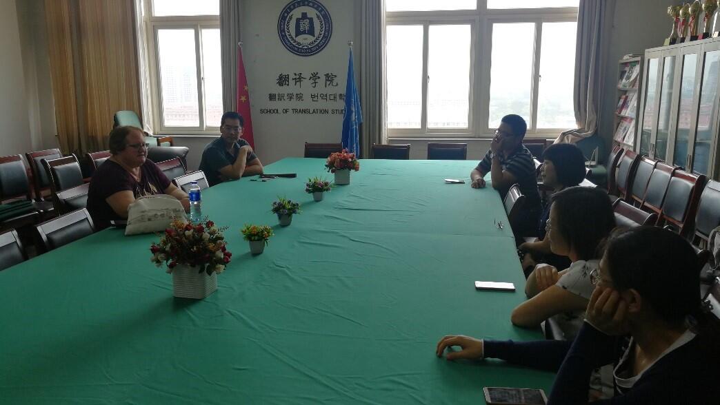 任教的16年里,乔妮为本科生、硕士研究生、博士研究生开设了《英语口语》、《英语写作》、《美国文学》、《英国文学》、《英语国家概况》等十多门课程。在教学过程中,她注重对学生综合语言能力的培养,把美国先进教育理念引入到教学中,方法灵活、生动活泼,极大地推动了学生的专业成长。伊咏教授代表全体教师为乔妮献花,表达了对乔妮的关心与祝福。随后,老师们与乔妮共同探讨了有关专业教学以及中美教育对比与差异等方面的问题,双方收获颇丰。
