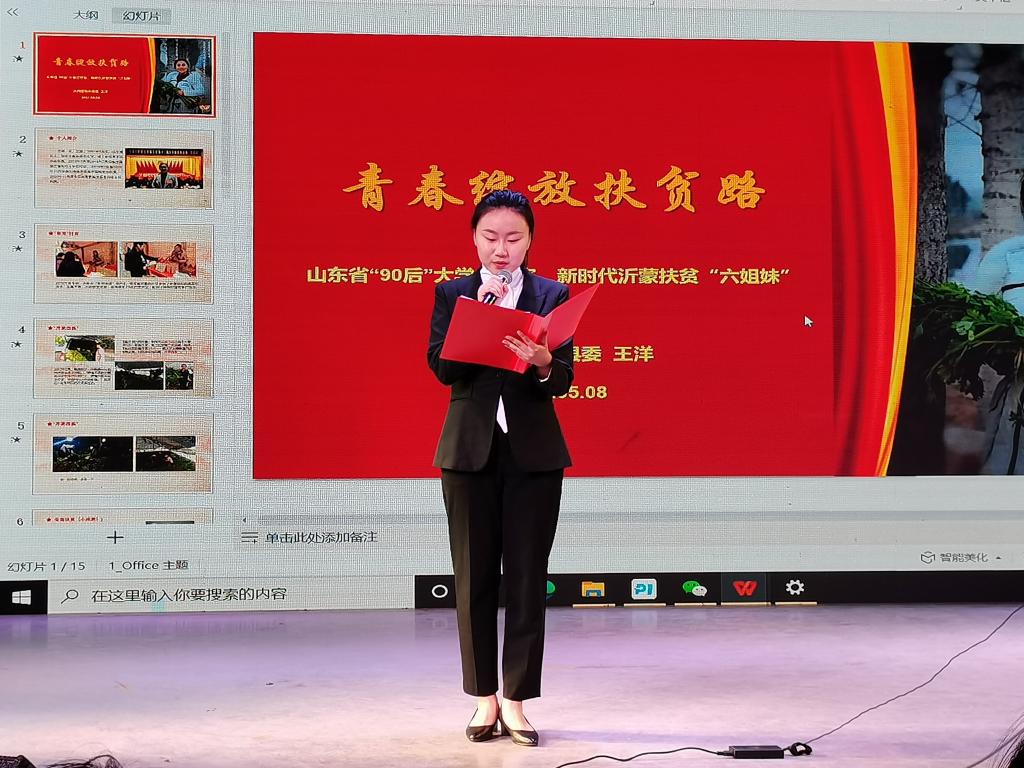 培训伊始,王洋老师以视频的形式向在座的各位学生介绍了大学生村官的意义,讲述了自身的扶贫经历。接着,王洋老师讲述了自己成为大学生村官后通过电商平台帮助百姓贩卖滞销芹菜,创建“朱村味道”农产品品牌等经历,带领各学生干部更深切地体会到农民生活的困难、开展农村扶贫工作的不易,使在场学生深受感动。在培训过程中,王洋老师以视频与故事相结合的方式,与学生干部积极互动,使此次培训更加生动,她不畏艰苦的工作态度和卓越的工作成果更是得到了学生们的敬佩。培训最后,王洋老师鼓励各位学生干部扎根基层、不忘初心、为民服务,叮嘱同学们努力学习,脚踏实地做好每一件事。至此,此次培训顺利结束。