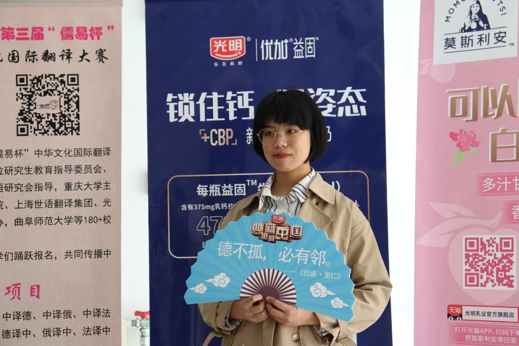 主讲人孙艺方上台进行宣讲。她从参赛对象、参赛项目、参赛方式等各方面介绍了大赛的具体情况及注意事项。同时,她强调本次大赛能对同学们的语言能力和专业素质起到积极的锤炼作用。随后,主讲人回放了历届大赛颁奖典礼的精彩视频,带大家回顾了大赛历史,激励大家积极展示自己的技能和风采,并争取在大赛中获得优异成绩。活动期间,同学们手持传统文化宣传板,在校园的各个角落,用中英双语进行现场短视频拍摄及大赛采访,在展现中国诗词含蓄隽永魅力的同时,也体现了曲园学子学贯中西的文化气质。本次宣传吸引了众多同学的目光,很多围观同学主动来到现场,踊跃报名并领取了精美礼品。活动最后,部分参赛同学代表及全体工作人员集体合影留念。至此,本次“儒易杯”中华文化国际翻译大赛线下推广活动圆满结束。