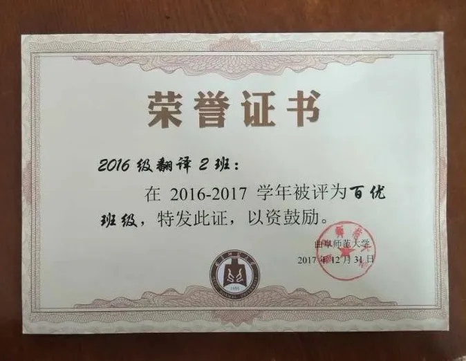 大学四年中,2016级翻译二班获得了许多优异的成绩:2016-2017学年百优班级,2017-2018学年优秀班级,2018-2019学年优秀团支部,2019年五四红旗团支部。