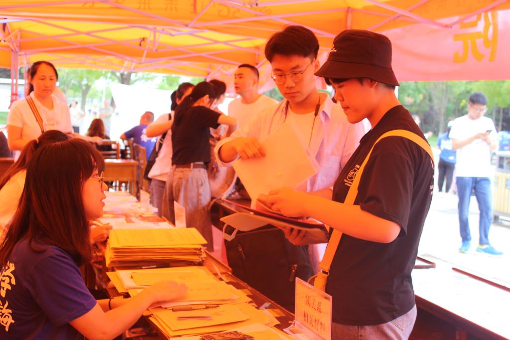 院旗背景墙合影留念。引导组带领新生入住宿舍园区。抵达宿舍后,园区人员帮助新生办理住宿手续,发放被褥暖壶等生活用品并示范内务整理工作。