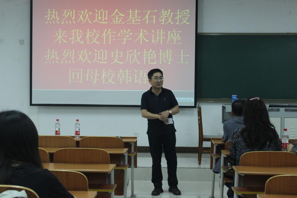 做学术讲座,并欢迎史欣艳博士回母校韩语系访问。接着,金基石教授就“关于中韩翻译理论—翻译要不要理论?”方面进行学术讲座。金基石教授从语言沟通的“通事(沟通信息)”功能和“通心(情感共鸣)”功能谈起,探讨中韩语言的特点与翻译的关系,中韩语言的可译性与抗译性的关系,翻译理论、方法、技巧与翻译实践的关系等。此外,金基石教授还从理论与实践相结合的视角,深入浅出的讲解了中韩翻译理论的认识功能、解释功能、方法论功能和检验功能。在提问环节,金基石教授耐心细致地回答了老师和学生们提出的问题。最后,金东国副教授对本次讲座进行了总结发言,并对金基石教授的讲解表示衷心的感谢。至此,本次讲座圆满结束。