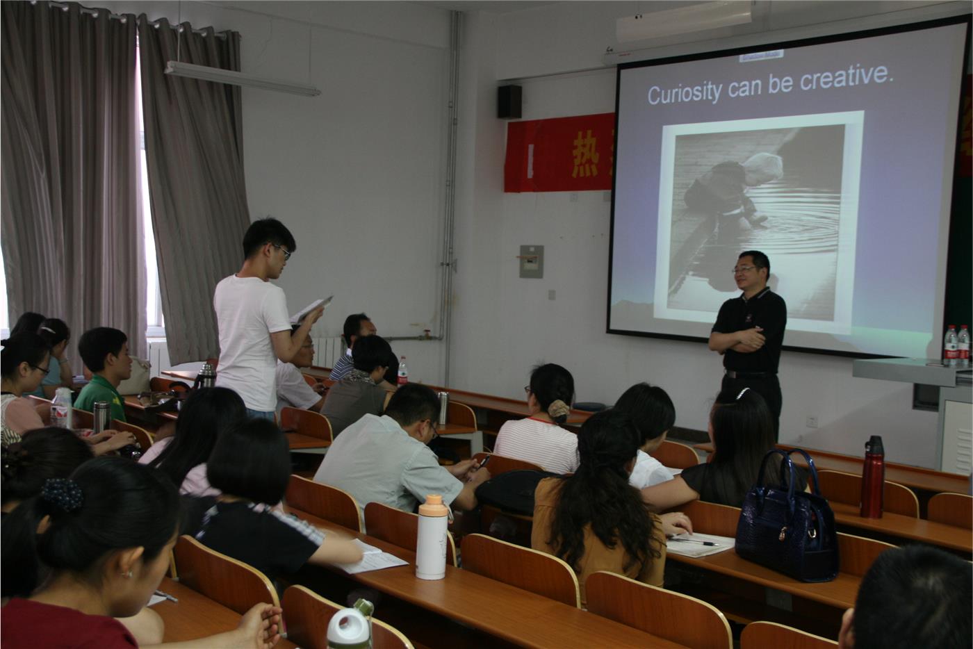 讲座伊始,张辉教授通过身后的PPT进行讲解,对“认知语言学(CL)与批评话语分析(CDA)的融合”的研究为导入线索,列举了Wodak、van Dijk、Chilton、O’Hallran、Dirven、Polzenhagen、Wolf等著名学术家的观点,将该讲座的理论依据和研究意义予以了详细解说。随后,张辉教授就CDA的基本思想和CDA研究的微观层和宏观层两个维度介绍了CDA的研究情况,并通过阐述CL与CDA在理论上的分歧与互补,证明了CL作为CDA语言分析的一种框架的合理性。最后,他还通过介绍CDA中的隐喻现象分析以及心理空间、概念整合理论与CDA的结合等具体实例指明了CDA与CL融合的主要途径,并就CL与CDA融合研究维度的问题对观众提出的问题作出了详细的解答,赢得了观众的阵阵掌声。