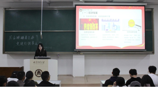 宣讲团紧紧围绕“推进文化自信自强,铸就社会主义新辉煌”、“万山磅礴看主峰,党建引领事业先”,依次列举了全国各地举办的丰富多彩的文化活动,这些活动形式多样、内容丰富,为在座的新生提供了精神盛宴,展示出我国蓬勃发展的文化产业,坚定了全社会的文化自信。宣讲团还通过列举一系列成绩斐然的建设项目,强调要坚定文化自信自强,坚定青年人对党的拥护与爱戴,使同学们深刻认识到党中央对进一步全面深化改革的统一领导的重要性。