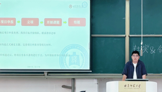 省级立项项目负责人2022级翻译二班朱韵升,结合自身经验详细讲解了选题策略、申报流程及评审要点。朱韵升从团队协作、资源整合路径等方面分享了自己的实战经验,为大家提供了切实可行的实践方案,帮助同学们快速掌握创新创业项目的核心要点与实操技巧。