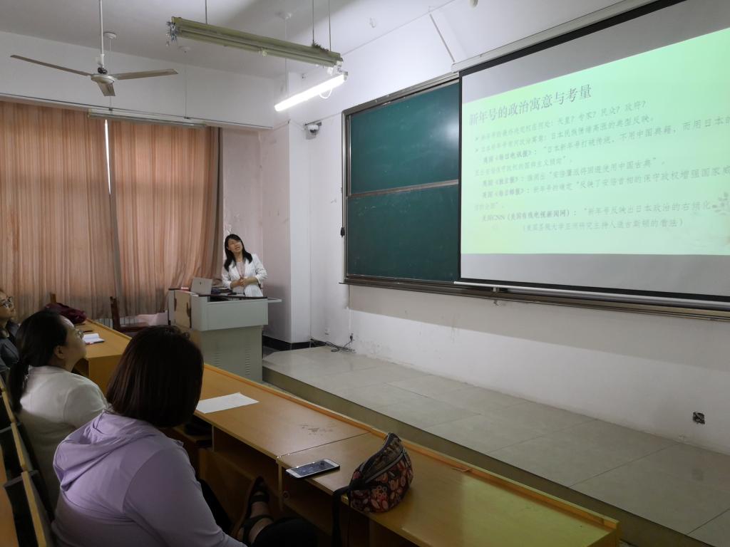 师生做了题为“日本的新年号‘令和’”的学术报告。报告由日语系主任邵艳平副教授主持,日语系部分教师、2016级、2017级、2018级本科生聆听了此次报告。