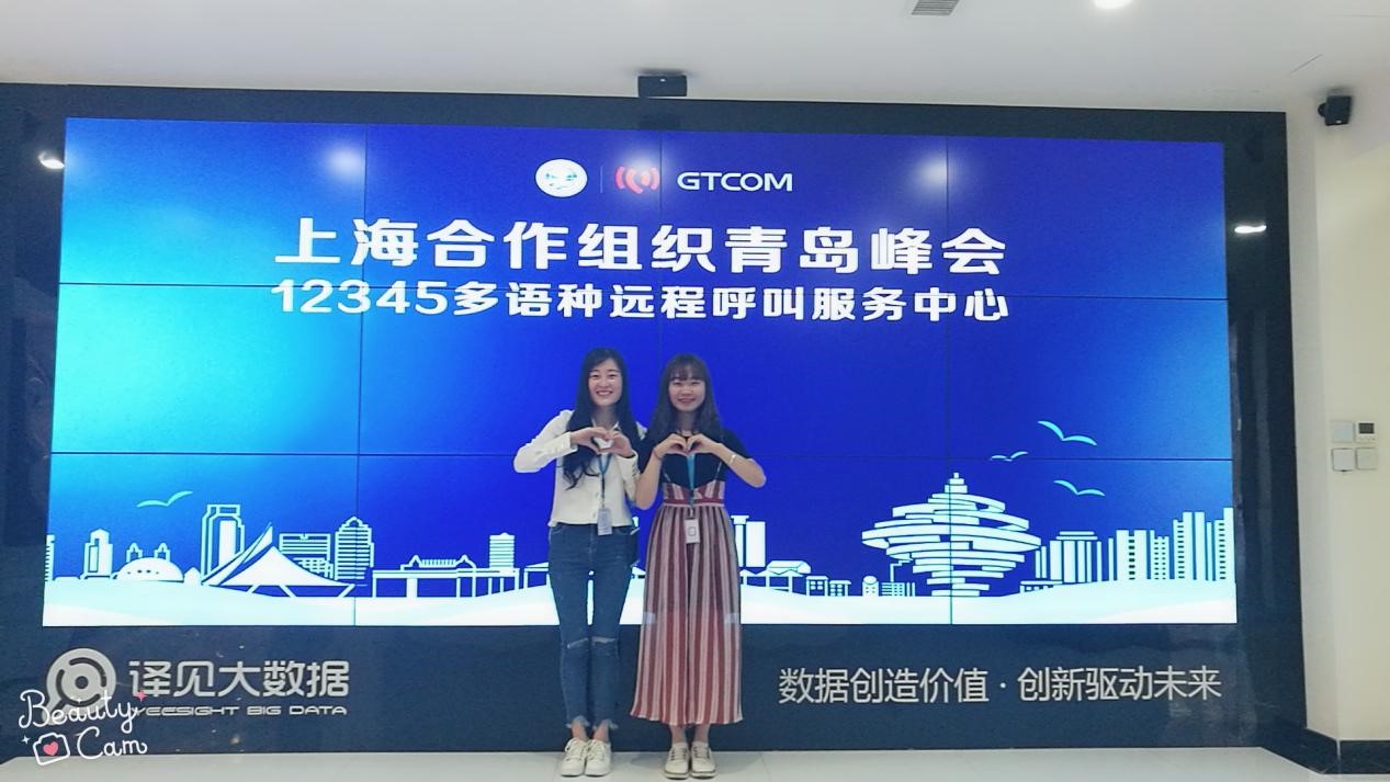 翻译专业刘梦怡、郑辉,商务英语专业巩慧捷、迟玉凤四位同学经过中译语通公司的选拔后作为英语译员,为青岛峰会提供远程呼叫服务。