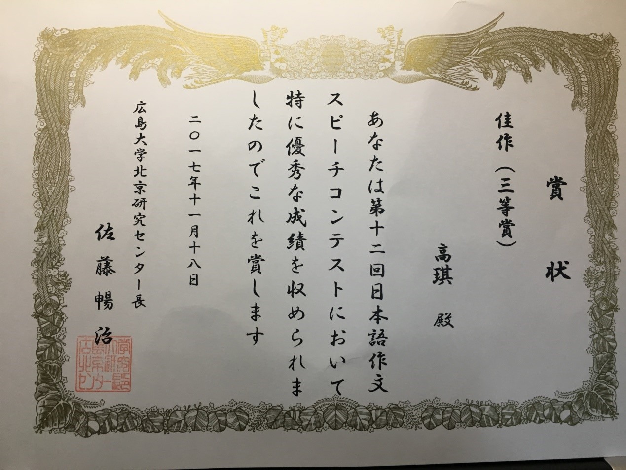 日语专业四年级高琪同学荣获三等奖。