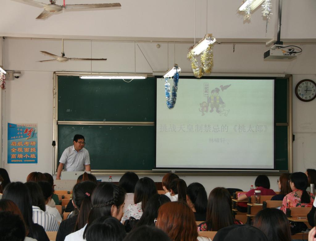在讲座接近尾声之时,同学们踊跃发言,提出自己的疑问和见解,林教授细心地给以解答。通过这次讲座,同学们对芥川龙之介的《桃太郎》有了新的认识,受益匪浅。