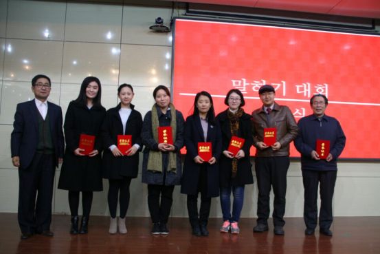 比赛伊始,由夏云副院长致辞,并由评委主任崔曦秀教授宣读比赛评分规则。此次比赛有大二、大三、大四共十八位参赛选手参加。演讲内容涵盖亲情、地理人文、韩国生活文化等各个方面。参赛选手们以流利的韩语与声情并茂的演讲感染了在场的每个人,赢得了阵阵掌声。此次比赛除选手们精彩绝伦的演讲外,还有多姿多彩的文艺汇演,悠扬的葫芦丝,动人的歌声,沁人心脾的吉他弹唱,将全场气氛推向高潮。比赛最后,崔曦秀教授根据参赛者的发音,熟练程度、语言技巧、舞台表现力等方面进行了点评评分,最终尹筱、刘蓓蓓、李婷同学分别获得了此次演讲比赛二三四年级组的一等奖。