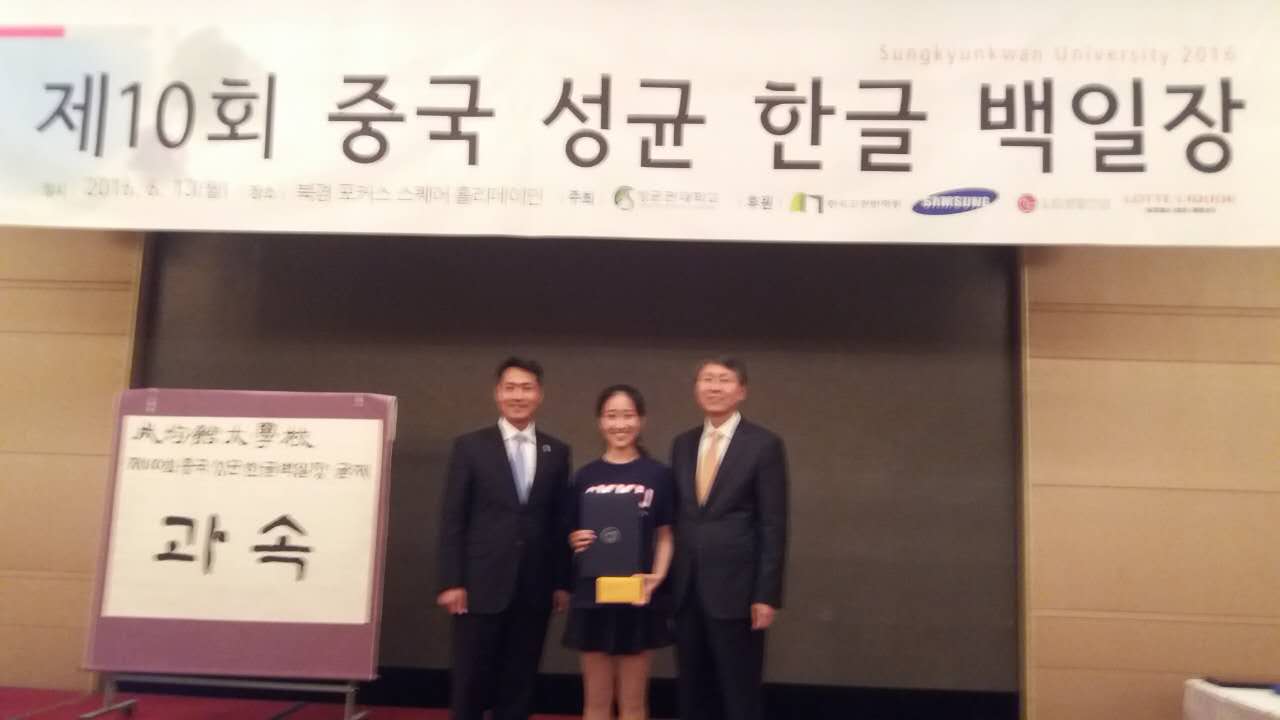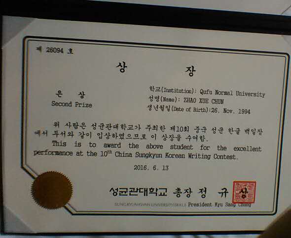 韩语系13级本科生赵雪纯在本次大赛中脱颖而出,以第二名的成绩荣获银奖,获得了全额奖学金进入成均馆大学攻读硕士研究生的机会。