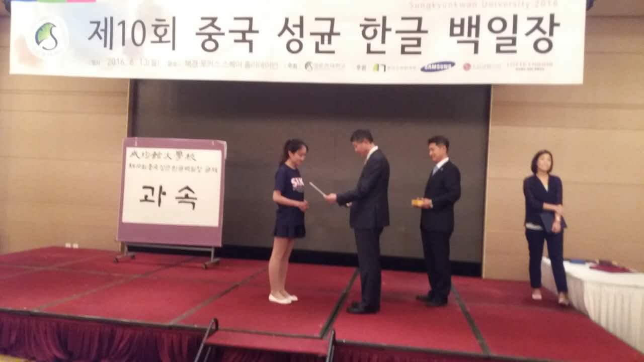2016年6月13日,第10届韩国成均馆杯全国大学生韩语写作大赛在北京方恒国际酒店举行。本次大赛由韩国成均馆大学主办,共有来自北京大学、北京外国语大学、复旦大学、天津外国语大学等全国52所高校共90余名拔尖学生参加了比赛,是目前我国国内规模最大、级别最高的韩国语写作比赛。本次大赛共设金、银、铜奖各1名、佳作奖10名、优秀奖10名。pg娱乐城