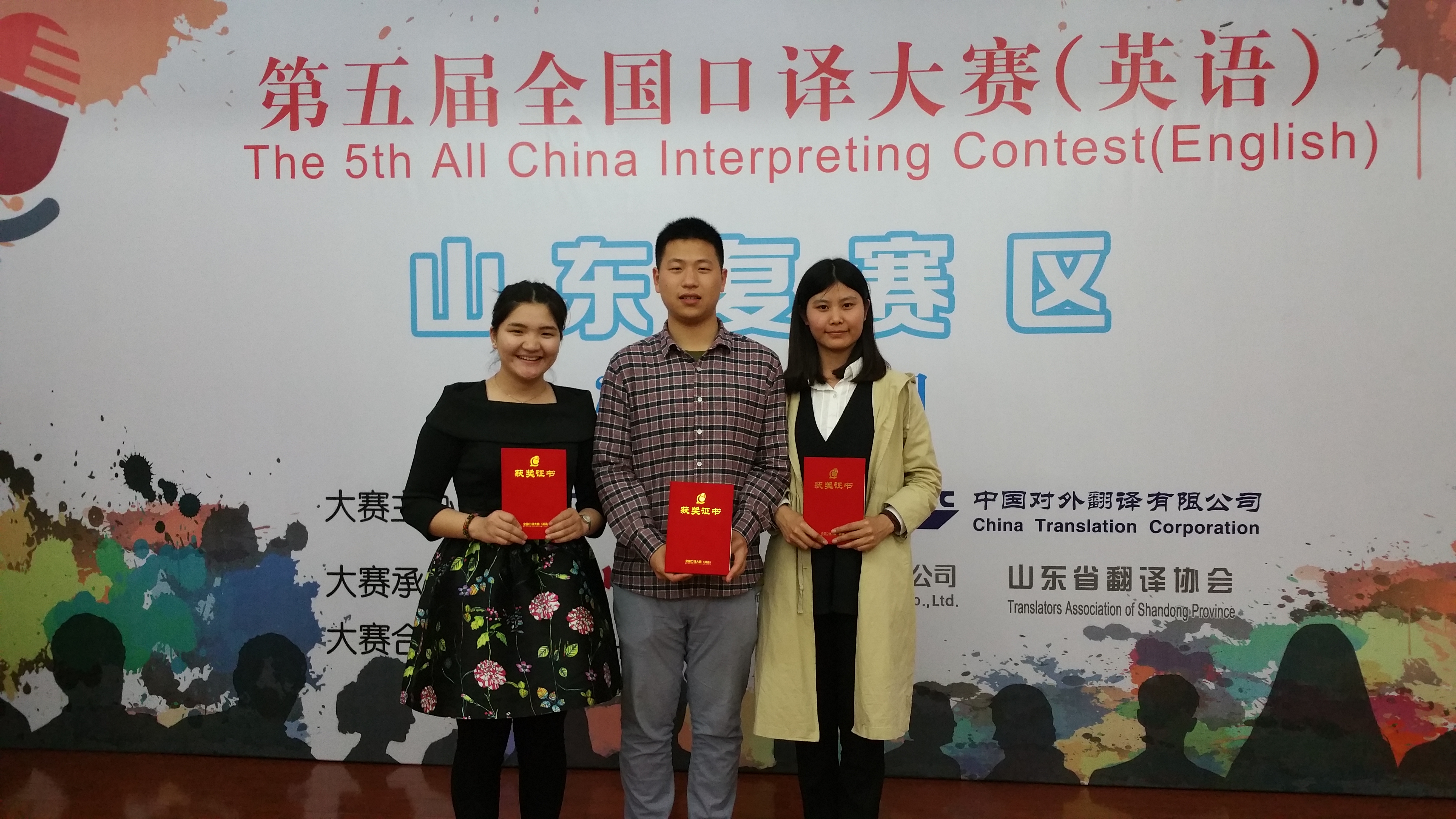 等省内20多所高校的71名选手参与其中。赛程分为英译汉与汉译英交替传译两部分,充分考验译者的双语能力。经过了前期的选拔和培训,面对高难度的比赛题目和实力雄厚的对手,三位同学凭借着扎实的双语功底、流畅的句式和清晰的逻辑思维,加之自信的台风,获得了山东省优秀奖的好成绩。