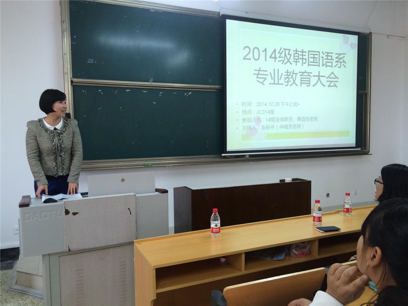 朝鲜语系主任金东国,副教授卢正爱,朝鲜语系其他几位老师以及朝鲜语系2014级全体新生参加了本次会议,本次会议由仲维芳老师主持。