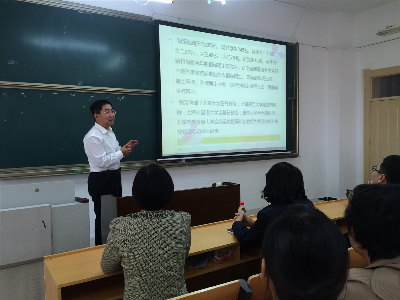韩语系历史,师资力量,教学成果以及科研成就等四个角度做了简单介绍。韩国语系建系9年,这九年里,在金东国老师的正确领导和韩语系师生的共同努力下,韩国语系发展迅速。并且介绍了韩国语系各种活动情况,学生多次参加国家级、省级比赛,并取得优异成绩。除此之外,金东国老师就中国国情以及现在国内韩国企业的发展状况,讲述了中韩两国的友好发展对两国的经济文化交流提供了坚实的桥梁,而在此现状下也造就了韩语专业存在的必然性,也为我们韩语人才的就业与发展提供了广阔的前景。紧接着老金东国老师对韩语系今后的课程安排及任课老师的介绍做了详细的讲述,同时特别强调了专业课学习的重要性。第二轮环节问题作答环节把见面会推向了高潮。针对同学们的各种疑问,各位老师为同学们作出了详细解答,拨开云雾见月明,使同学们更加清楚学习的目标与努力的方向。 最后,各位老师依次送上对同学们大学四年的建议和美好祝愿。