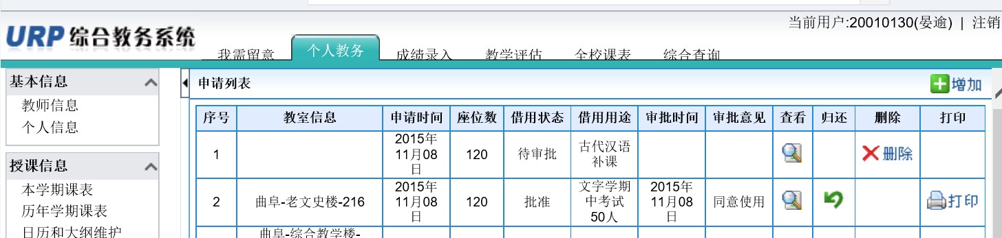 2.填写完以上项目后,点击右上角“保存”,即提交了一条借用申请。然后电话联系教务行政科(0537-4458021、0633-3981607)进行审批操作,审批后会显示审批意见。如下图。如果申请后又不需使用,可点击“删除”(尚未审批的)或“归还”(已批准的)。