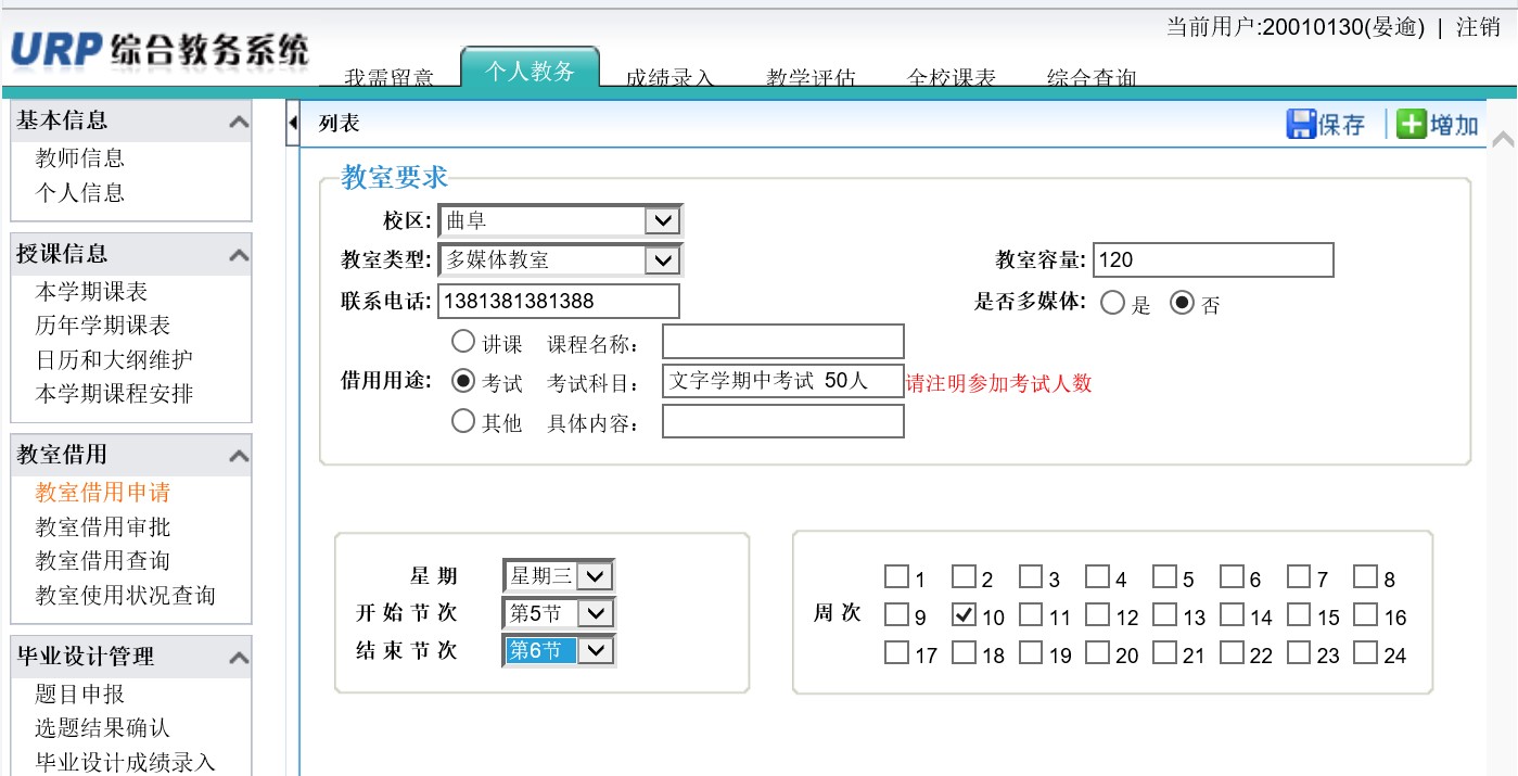 信息门户登陆后,进入教务系统,在“个人教务”模块,点击左侧的“教室借用申请”,点击右上角的“增加”,即可增加一条教室借用申请。填写清楚系统提示的各项内容即可。注意周次要按校历的实际周次勾选。